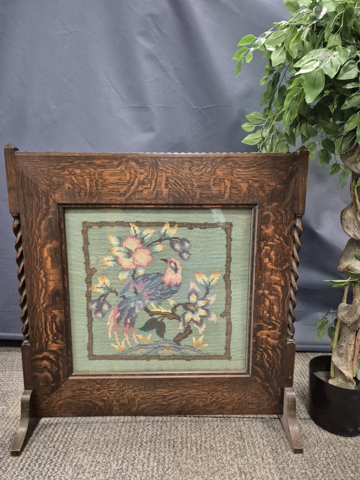 1920s English Oak Framed Fire Screen With Bird Tapestry Design