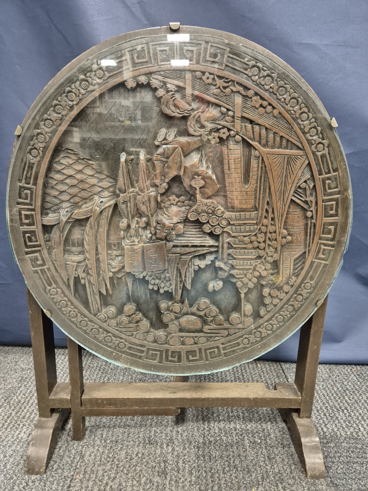 Antique Chinese Hardwood And Glass Carved Tilt Top Table